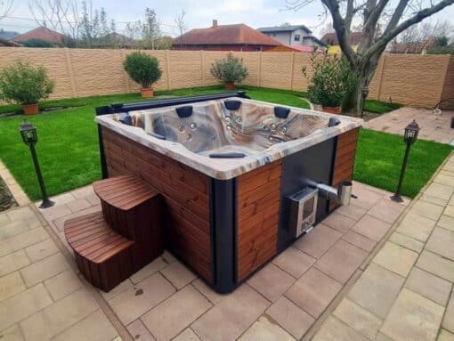 GRANDE 8 SZEMÉLYES NÉGYSZÖGLETES AKRIL DÉZSAFÜRDŐ INTEGRÁLT KÁLYHÁVAL