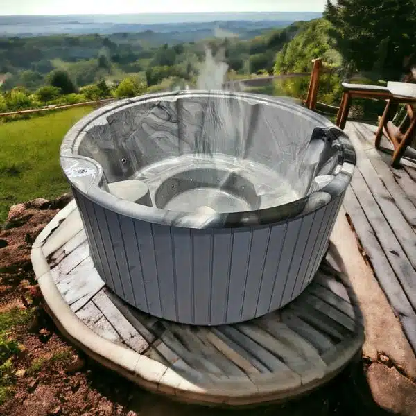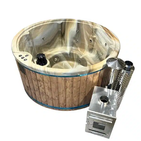 MEGÚJULT LUX IN 6 személyes SÓZHATÓ KÜLSŐ KÁLYHÁS PRÉMIUM MÁRVÁNY AKRIL dézsafürdő MÁRVÁNY betéttel